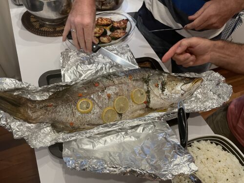Über 3 Kilo war der Baramundi schwer. as tun mit so einem Kerl? Ich habe zum spontanen Fischessen eingeladen über unsere Mt Hagen Ladies WhatsApp Gruppe. Das klang in etwa so: Heute Abend gibts Fisch im Glass-Haus. Wir teilen gerne und laden 10 Leute ein. Bringt ein Gericht dazu und dann schauen wir mal, wer alles um den Tisch sitzen wird…
