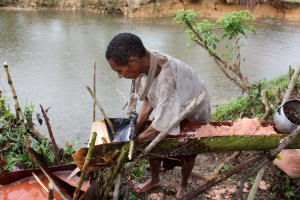 Wir gehen derweil zur Bibelschule. Eine Brücke gibt es nicht. Also waten wir durch das erfrischende kühle Nass. Wir setzen uns in die Klasse und hören eine Einheit zu den Gemeinsamkeiten und Unterschieden im Glauben der Siebentags Adventisten. Wir lernen auch noch was!Das Zuhören wird etwas erschwert durch den aufs Wellblechdach trommelnden Regen.Nach der Lektion ist Pause. Zeit, unsere kleinen Mitbringsel zu verteilen und ein wenig ins Gespräch zu kommen, wie unterschiedlich Glauben in der Öffentlichkeit, in den Medien und in den Schulen gelebt wird, vergleicht man Deutschland und Papua Neuguinea. Durch den zwischenzeitlichen Regen ist uns dann auch der Rückweg durch den Fluss unmöglich. Jetzt kommt braune Brühe und der Wasserstand ist auch beträchtlich angestiegen. Wir bleiben also noch diesseits des Ufers. Auf der anderen Flussseite sind die Frauen schon beim nächsten Arbeitsgang: dem Auswaschen der Sagospäne in selbstgezimmerten Vorrichtungen aus dem, was im Busch zu finden ist.