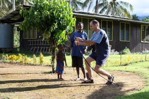 Und getroffen ergibt sich die Kokosnuss in fünf Meter Entfernung – kampflos.