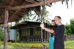 Kaum zu glauben, dass mit so einem hölzernen Bogen früher Stammeskämpfe ausgefochen wurden. Heute wird der Bogen nur noch zur Jagd im Busch oder im Wasser verwendet. Der Bogen besteht aus einem besonderen Hartholz. Die Hartholzbäume stehen nicht gerade um die Ecke, sondern hoch im Gebirge. Aber es darf ja auch ein bisschen Mühe und Schweiß kosten, um den besten Bogen zu bekommen. Als Sehne wird ein Stück Bambus verwendet. Erstaunlich was diese Sehne alles aushalten kann. Der Pfeil ist ein dünner Bambus-Schaft mit einer Hartholz-Spitze. Manche Spitzen sind einfach nur spitz, andere Spitzen bestehen eigentlich aus drei und werden für den Fischfang verwendet. Und wieder andere Spitzen sehen aus wie ein kleines Paddel und werden aus geschliffenen Bambus-Schalen hergestellt. Und wie geht man mit so einem Bogen um? Der Bogen wird mit der linken Hand so gehalten, dass der Zeigefinger den Pfeil umschließt aber nicht festhält. Die rechte Hand zieht mit Mittel- und Ringfinger die Sehne zurück und Daumen und Zeigefinger halten das Ende des Pfeiles fest. Mit viel Kraft wird wird die Sehne gespannt und das Ziel anvisiert.