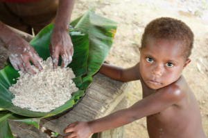 Damit das Ganze auch noch etwas Geschmack bekommt – Saksak als solches schmeckt fast nach gar nix – kommt noch das Innere einer Urwaldfrucht darüber. Einen Namen für diese rote Frucht konnte sie uns nicht nennen, Frut bilong bush, em tasol.
