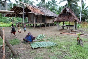 Und wir haben unser Airstrip-Inn-Hotel bezogen: Ein ehemaliges Missionshaus in klassischer Holzhausbauweise mit Wellblechdach und sogar Solarzelle obendrauf, gebaut 1985, renoviert und erweitert vor ca. 5 Jahren. Wir freuen uns an dem Luxus des Gasherds, der Regenwassertankleitung, WC und Eimerdusche, einem Bett mit Moskitonetz und ausgestatteter Küche sowie des elektrischen Stroms. Klein, aber fein.All unsere Nachbarn für diese Woche wohnen auf Stelzen-Häusern. Gebaut nicht aus gehobelten Brettern, sondern grob bearbeitetem Buschmaterial. Dennoch recht großräumig und teilweise wirklich liebevoll mit geflochtenen Buschmatten als Raumteiler bzw. Fensterläden. Nebenan in der Regel ein sog. Haus Win. Dort trifft man sich zum Schwätzchen halten. Meist hat es auch eine Feuerstelle und dient als Kochstelle. Etwas vom Wohnhaus entfernt, zwischen den Büschen hinterm Haus versteckt gibt es noch das Haus Liklik – für die gewissen persönlichen Geschäfte…