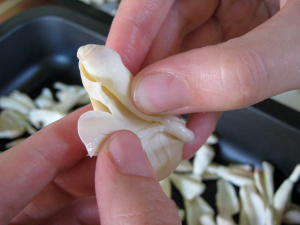 Die Nuss selber ist jedoch anders konstruiert wie die Mandel. Sie gleicht eher einem Kohlkopf. Man kann sie leicht auseinanderdrehen und erhält dann einzelne dünne Blättchen. Meistens lass ich die „Würmer“ jedoch ganz und schneide sie in kleine Ringe. Das sieht zum einen ganz witzig aus und ist besser zur Weiterverarbeitung: für einen Nusszopf, fürs Müsli, für Nussstreusel auf dem Eis, …Na, Appetit bekommen?