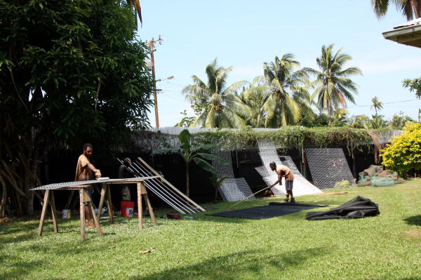 Ein seltener Anblick: drei Arbeiter, die auch wirklich arbeiten. Ihre Aufgabe ist es, die Fliegengitter an einem der Pilotenhäuser zur erneuern. Friends in Action ist eine amerikanische Organisation, die vor allem Missionen und Hilfsorganisationen bei handwerklichen Vorhaben zu guten Konditionen hilft. An ihrer Arbeitsmoral merkt man, dass sie Christen sind.Heute werden sie fertig. Feine Sache!Nur zu dumm, dass schon wieder die nächsten Baustellen warten und die leider an eine andere Firma vergeben wurden, die gleiche wie am Hangar… Entsprechend hab ich gestern mal wieder vergebens auf die Handwerker gewartet. Wollte eigentlich in den Meri Lotu (Frauengottesdienst)…