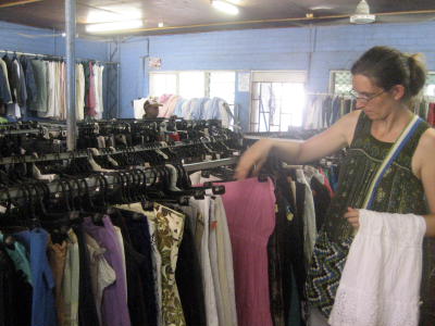 Jetzt nur kein Englisch-Wörterbuch holen! Dieses Wort ist da nämlich nicht zu finden, sondern eine Wortneuschöpfung innerhalb der MAF-PNG-Ladies und bezeichnet als solches eine Art Hobby: Second Hand Shopping. Kaum zu glauben, dass man – ich sollte besser sagen „frau“ – sich wirklich dafür begeistern kann. Aber was hat man, ähm, frau, hierzulande für Möglichkeiten, die eigene Garderobe aufzufrischen, will frau und ebenso ihr Mann nicht nur mit den spärlich bei der Einreise mitgebrachten und von den hiesigen australischen Wirbelwaschmaschinen schneller demolierten Kleidern leben. Jedenfalls, einen H&M oder C&A oder irgendwelche Versandhauskataloge sucht frau hier auch vergebens. Was es gibt, sind so null-acht-fuffzehn-Klamotten im Sinne von klassischen unifarbenen T-Shirts und Poloshirts oder eben die sogenannten Meri blauses, weit schwingende Oberteile aus synthetischem bügelfreien Material aller Farben und Muster – die typische Kleidung der PNG-Frauen. Grundsätzlich gilt für die Frau: Figurbetont ziemt sich nicht. Alles immer schön weit und vor allem auch bis übers Knie. Was mich betrifft, ich freu mich an meinen beiden meri blauses aus Madang. Die sind aus Baumwolle und haben einen doch noch ganz netten Schnitt. Naja, in Deutschland würde ich dann vielleicht doch nicht so rumlaufen, aber hier schon. Sie sind bequem und bei der Hitze hier total angenehm luftig. Oft höre ich dann auch die Einheimischen untereinander tuscheln: „wait meri i gat naispela meri blaus“ (Die weiße Frau hat eine schöne Bluse an.) … Das verschafft mir einerseits Achtung und andererseits auch Sicherheit, mich hier in der Stadt und auf dem Markt zu bewegen. So ist man bzw. frau den Einheimischen gleich sehr sympatisch und zeigt, dass frau kein „Durchgangstourist“ ist. Aber auch hierzulande ändert sich so manches und auch zwischen dem Hochland und der Küste zeigen sich unterschiedliche „Freiheiten“. Je weiter man/frau jedoch in die Buschdörfer kommt, um so „enger“ die Regeln aber unter Umständen auch umso freizügiger, frei nach dem Motto „bush tru“…