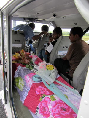 Montag – Bodycharter nach Tekin Die Schülerin aus dem Hochlanddorf Tekin hat in Passam in der Nähe von Wewak an der Küste die 12te Klasse besucht. Vergangenes Wochenende wurde sie mit Malaria in das Krankenhaus eingeliefert, wo die Doktoren ihr nicht mehr helfen konnten. Sie verstarb. Am Montag flog ich den Sarg mit Familienangehörigen und dem Schulleiter nach Tekin. Viele Schüler kamen zum Flugplatz, um sich noch einmal von ihrer Mitschülerin zu verabschieden. Hierzulande ist in den Särgen oft ein kleines Fenster in Kopfhöe eingearbeitet.
