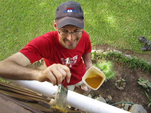 Wir bürsten unsere Veranda, um sie am Wochenende zu streichen. Das gehört zur Pflege und Erhaltung des Hauses.