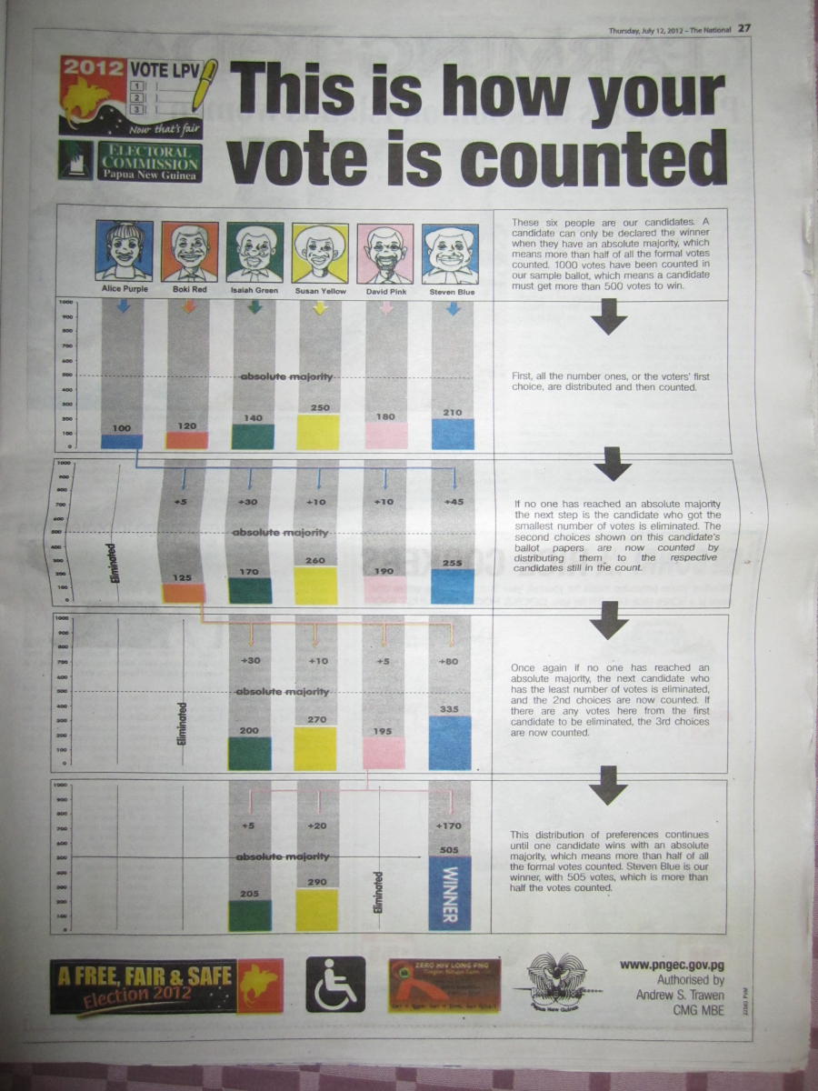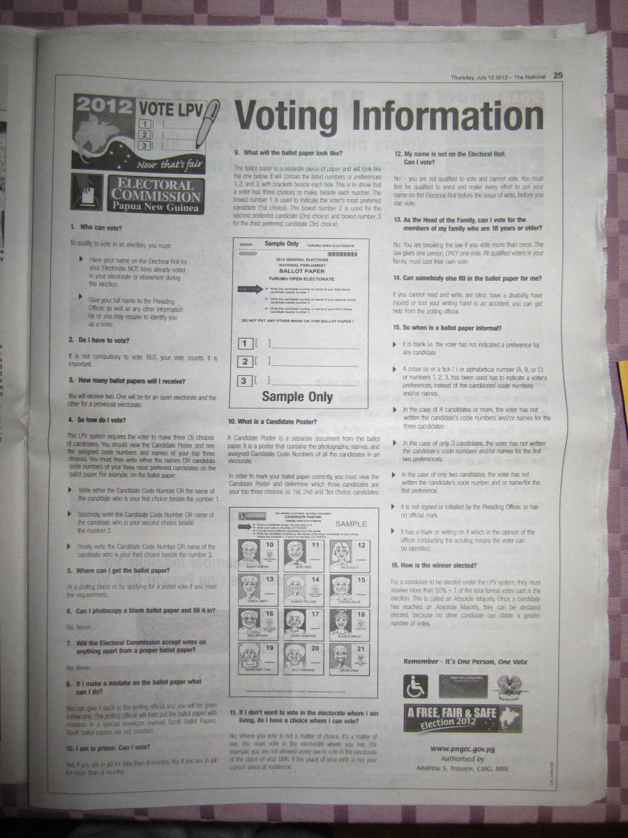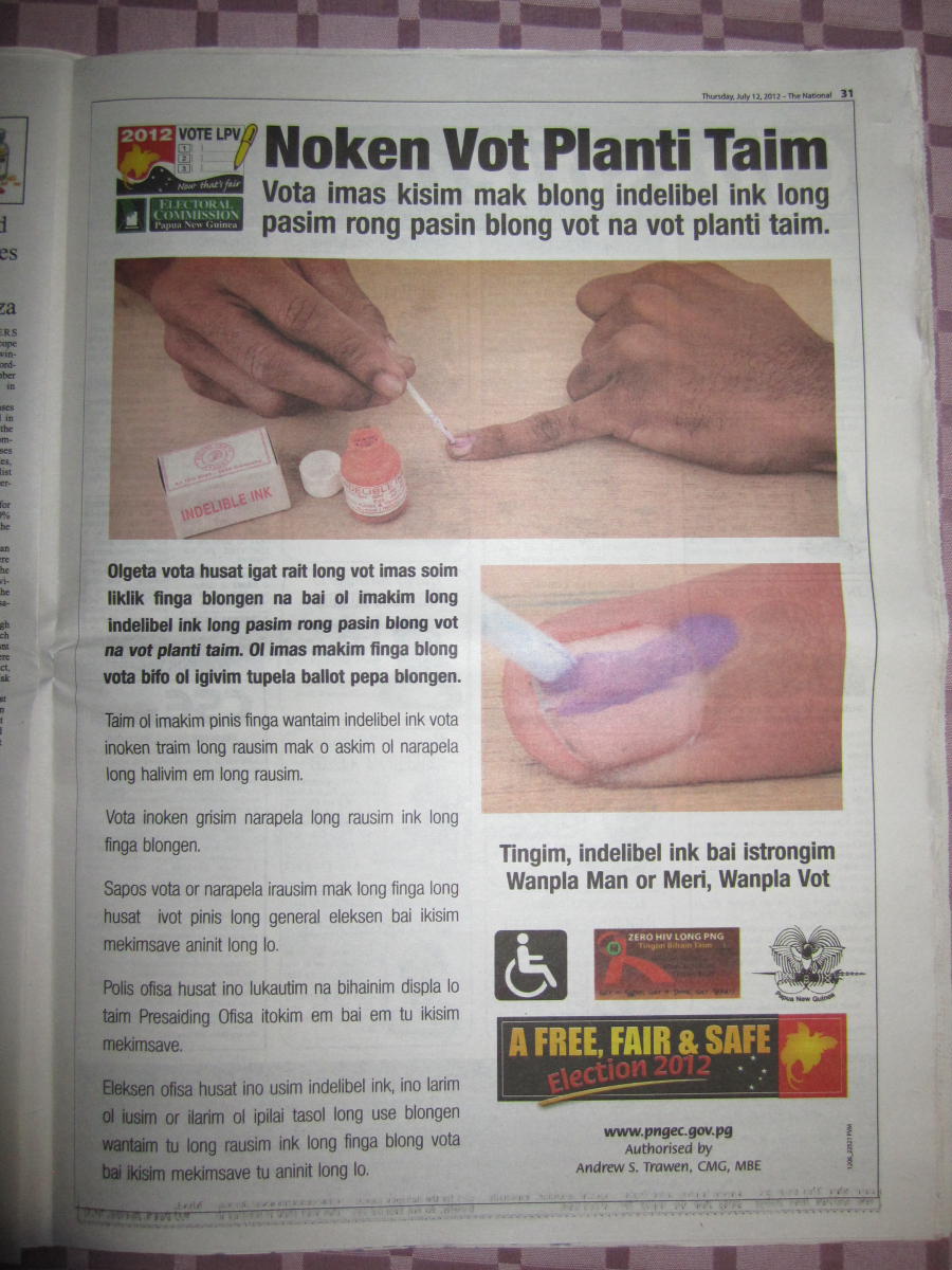 Von der Durchführung wollen wir mal gar nicht reden. Die Tage stand ein Zwischenbericht der Wahlbeobachter des Commonwealth in der Zeitung, was gut läuft und was weniger. PNG hat noch ziemlich viel zu lernen…