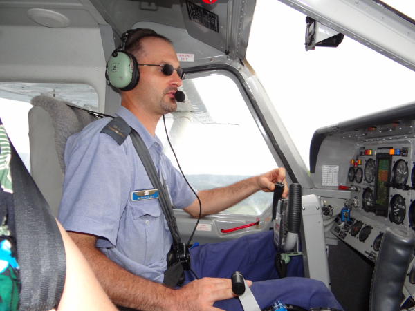 Nachdem das Flugzeug gecheckt und betankt und alle Papierarbeit erledigt ist, heben wir 9:14 Uhr ab und starten in westliche Richtung, fliegen über unseren Compound und die Wom-Halbinsel, unseren Lieblings-Bade-Schnorchel-Strand.