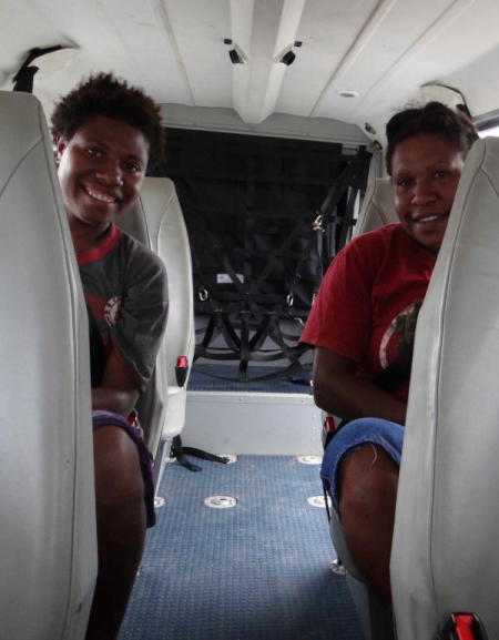 Um 11:27 Uhr heben wir mit den beiden jungen Frauen ab Richtung Wewak. Angela ist die Jugendgruppenleiterin von Lumi. Und wer weiß, vielleicht wird Josephine eines Tages ihre Nachfolgerin.