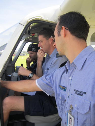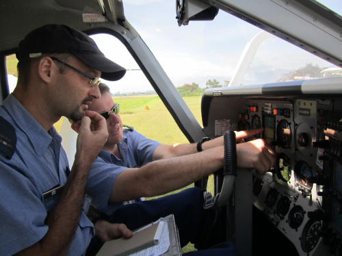 Der Herr Mechaniker, der mit der Mütze weil es ja im Hochland so kalt ist oder eben weil es einfach nur cool aussieht ;o), der Chefpilot und der zukünftige Crew und Trainingsmanager. Sie alle sitzen in Mathias´ Flugzeug, das in der Zeit der Konferenz ein neues Update für seinen Mini-Flachbildschirm bekommenen hat. Der Mini-Flachbildschirm ist ein Aspen Evolution Flight Display 1000 und das kann jetzt durch die Wolken schauen. Auf dem Bildschirm sieht Mathias eine künstliche Landschaft, die das Gelände vor dem Flugzeug abbildet. Was es nicht alles gibt? Trotzdem bleibt die reale Landschaft aus dem Fenster betrachtet immer noch unschlagbar eindrucksvoll.