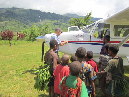 Das Flugzeug war dann auch schnell umringt von vielen Leuten aller Generationen. Interessant war, dass die jungen Buben und Männer zusätzlich zu ihrer mittlerweile westlichen Kleidung aus T-Shirt und Shorts noch einen Buschwedel ums Hinterteil gebunden hatten. Dass lässt erahnen, wie die „Kleidung“ vor gut 50 Jahren aussah. Sicherlich gabs auch für vorn noch irgendeine Bedeckung der Scham…