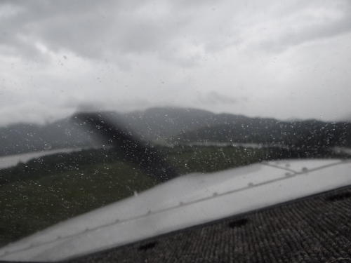 Und dann kommt´s richtig dicke! Regen, Regen, Regen! Vielleicht bleiben wir ja doch noch zum Mittagessen in Moropote… Zwei Stunden später klart es kurz ein wenig auf. Hoffnung! Mathias läuft auch den Landestreifen ab und entdeckt, dass das Wasser kaum abfließt und sich teilweise in großen Pfützen zwischen dem dichten Gras sammelt. Kein Wunder, die vor Jahren angelegten Entwässerungsgräben sind mittlerweile zugespült und zugewachsen. Das sieht nach Arbeit aus!