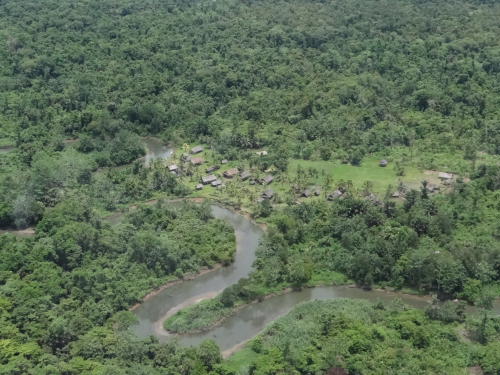 Im Steigflug sehen wir schon bald Saronapi vor uns liegen und grüßen die Leute mit einer kleinen Ehrenrunde. Mit dem Flugzeug gerade mal 2 Minuten. Zu Fuß und per Kanu 2 Stunden!
