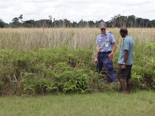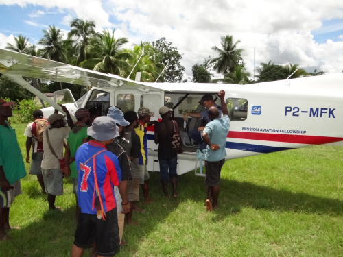 Kurz vorm Abflug in Wewak klopft noch Pastor Dennis von der EBC an das Bürofenster. Er bittet uns, viele Fotos vom Landeplatz zu machen, von den Entwässerungsgräben, dem Windsack, dem Rasenmäher. In diesem Fall ist die EBC, die Evangelische Brüdergemeinde, verantwortlich für den Landeplatz. Pastor Dennis, der für die Finanzen im Sepikdistrikt zuständig ist, ist gerade dabei einen Bericht an die Regierung zu schreiben über die Zustände der drei EBC-Landeplätze im Sepik, um Fördergelder zu beantragen. In der Anfangszeit war ein Landeplatz immer Sache der gesamten Dorfgemeinschaft, gemeinsam wurde er gebaut und mit Buschmessern regelmäßig Grad geschnitten. Das ist viel Arbeit, anstrengende Arbeit! Irgendwann konnte man sich einen Traktor leisten, der nun mit Motorschaden im Schuppen steht. Vor ein, zwei Jahren gab es Ersatz durch einen Deutscher Rasenmäher. Nun ist allerdings der Keilriemen gerissen und keiner vom Dorf ist mehr bereit, für die gute Sache sein Buschmesser zu schwingen – es sei denn, man wird dafür bezahlt. Segen und Flug der modernen Technik…