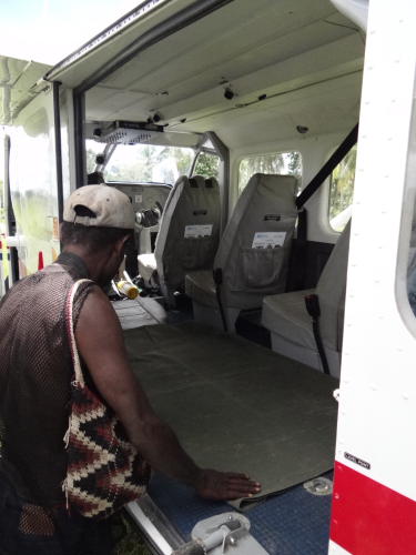 Nachdem der Flugplatz abgelaufen und inspiziert ist, wird es nun mehr als Zeit, die Vorbereitungen für den Medevac zu treffen. Sitze müssen ausgebaut werden, damit die Frau liegen kann. Auch die Flugpapiere müssen ordnungsgemäß ausgefüllt werden. Die Frau wartet in einer Hütte nahe dem Flugplatz, umgeben von vielen anderen Frauen des Dorfes. Männer haben eine einfache Trage gebaut, falls sie selbst nicht in der Lage sein sollte, diesen Weg von etwa 80 Metern zu gehen.