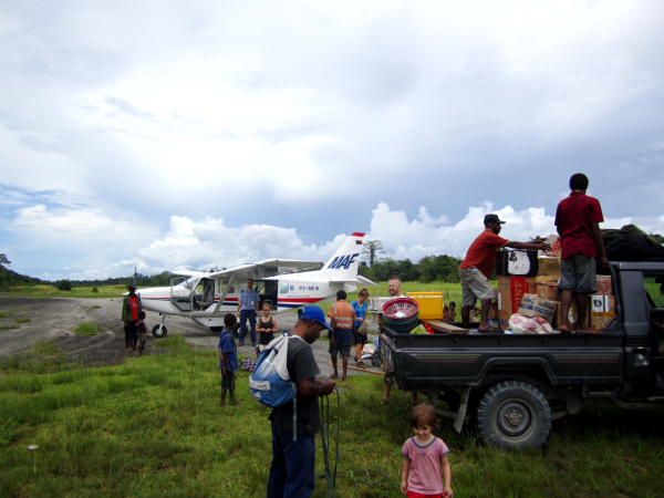 Luke und Laura und jede Menge Baumaterial wurden vergangene Woche schon von der MAF Caravan nach Tadji, dem ihrem Einsatzort nächstgelegenen Landeplatz geflogen. Von da aus sind sie noch einen halben Tag per Truck und Kanu unterwegs. Mathias hatte diese Woche drei weitere Flüge mit seinem Airvan nach Tadji für die SIL Leute: Baumaterial, Ben und Mandy mit ihren fünf Kindern, die das Team verstärken werden und zwei Schreiner, die beim Bau eines neuen Missionshauses helfen.
