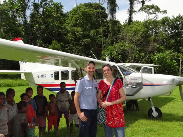 Wir verabschieden uns und kommen endlich zu einem schönen Foto von uns beiden vor einem MAF Flugzeug mitten in der Sepik-Ebene.