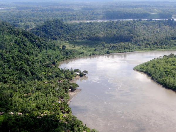 Ich durfte währenddessen eine Stunde in Sino am Boden bleiben und hatte Gelegenheit, mal die Station unserer deutschen Freunde Miriam und Frank und ihr Dorf zu besuchen. Sie planen mit ihrer Übersetzung des Neuen Testaments Ende 2014/Anfang 2015 fertig zu sein. Von ehemals drei Familien, die im Jahr 2000 ins Dorf nach Sino gezogen sind, sich ihre Häuser gebaut haben, Sprache und Kultur der Leute gelernt haben, ein Alphabetisierungsprogramm aufgebaut haben, Frischwasserleitungen im Dorf verlegt haben und vieles mehr, sind sie die letzten, die noch dort leben. Da Buschhäuser eh nur eine begrenzte Lebensdauer haben, ist ihre Station auf zwei Häuser geschrumpft, ihre Wohneinheit wirklich winzig, aber dafür mit einer kleinen schnuckeligen Veranda mit Sicht über den großen Sepikfluss.