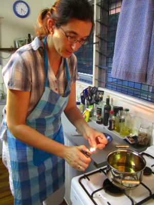 Sean war allerdings ganz begeistert von seinem ersten Tintenfischabendessen. Also habe ich mich mal bei ihm eingeladen, als er Tintenfisch Nummer Zwei zubereitete. Ich habe ja keine Ahnung, wie man so ein Teil pfannenfertig zurichtet.