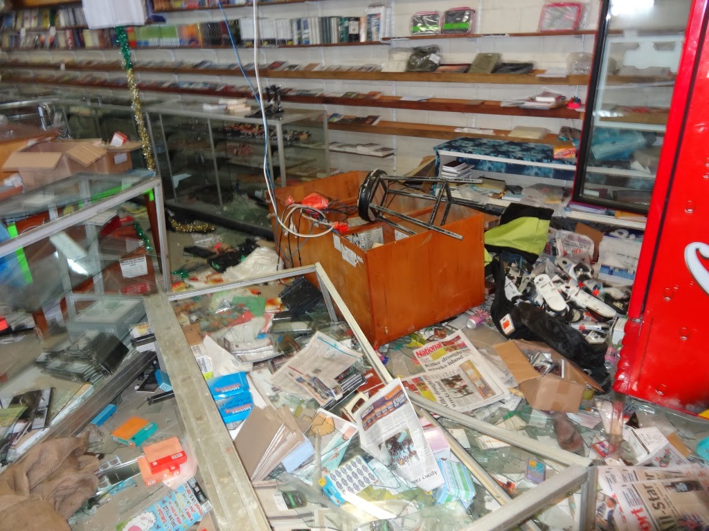 Die beiden Fotos machen den Kontrast zwischen dem Zustand des Verkaufsraumes deutlich – nach den Plünderern und nun das neu renovierte Geschäft.