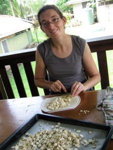 Bei beiden muss man jedoch ersteinmal den „Airbag“ entfernen, der die Kokosnuss beim Aufprall vorm Zerplatzen schützt, bevor man zum harten Kern vordringen kann. Das geht entweder mit dem Buschmesser oder mit einem Steckeisen, das in den Boden gerammt wird (siehe Foto). Mit dem Buschmesser wird Mathias immer schneller! ;o) Das „Airbagmaterial“ wird meist verbrannt. Die Einheimischen kochen in der Regel über offenem Feuer und so haben sie gleich das Brennmaterial vor der Hüttentür. Danach muss man die eigentliche Kokosnuss knacken und das möglichst so, dass man zwei gleiche Hälften hat. Der Trick ist der, immer genau auf die drei Adern, die sich um die Kokosnuss ziehen, zu schlagen. Manch Einheimischer braucht nur 5 Schläge für die Nuss. Das muss Mathias noch üben! ;o)